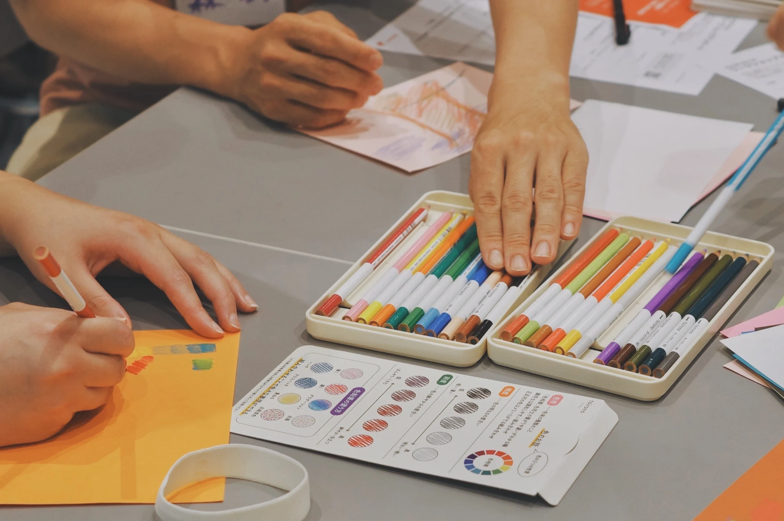 さて、これまでのワークショップでは、アートカードを使ったワークを中心に構成してきましたが、今回は三菱鉛筆のご協力をいただき、「toirono」という色鉛筆を使って絵をかくワークを実施いたしました。